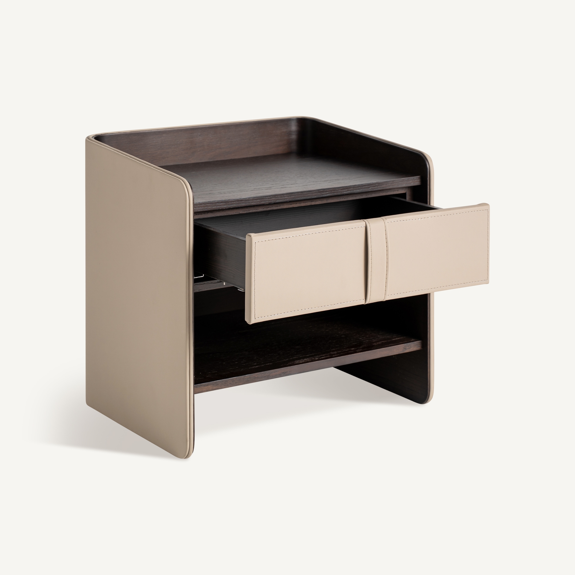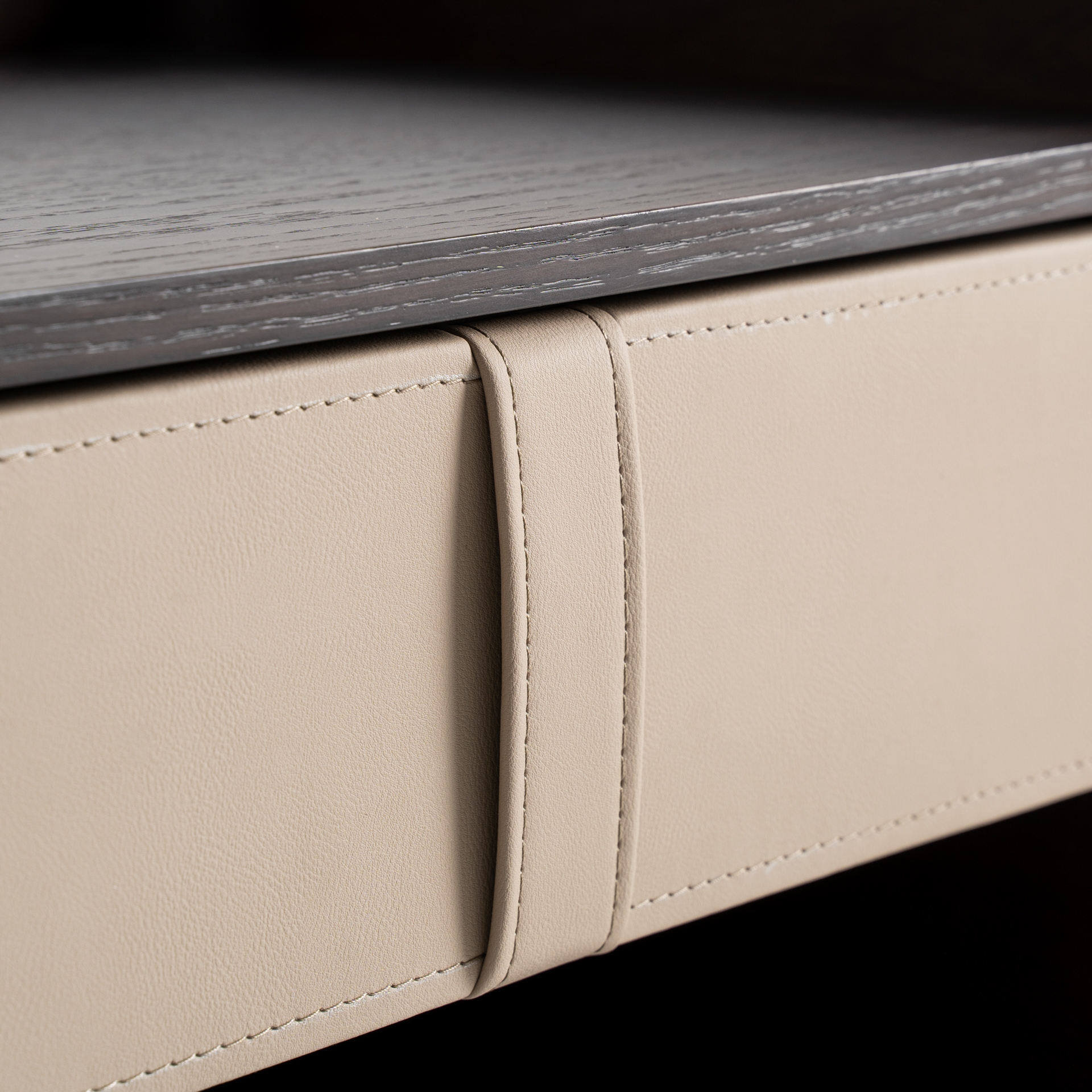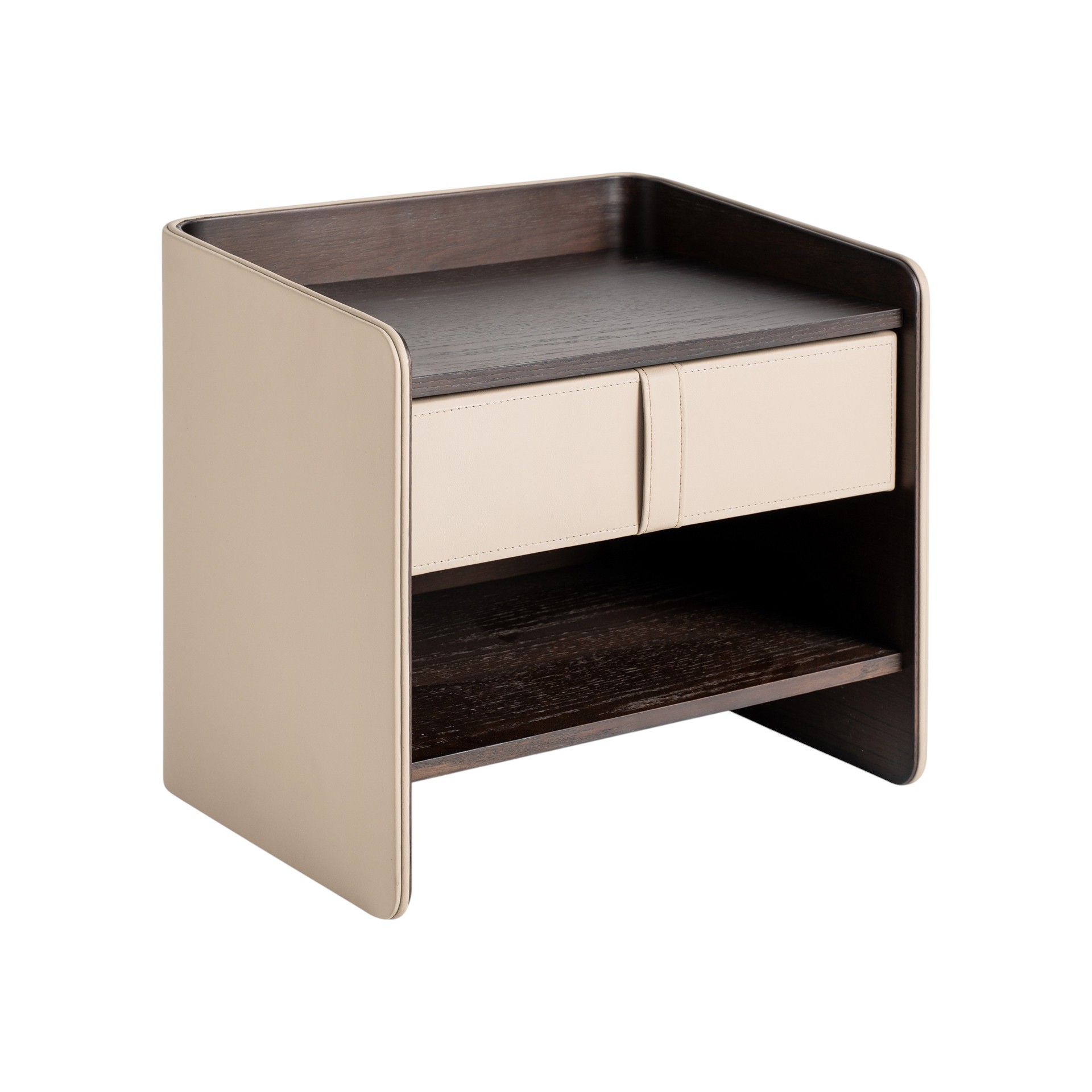 Элегантная и современная прикроватная тумбочка от бренда Vical станет идеальным акцентом в роскошной спальне. Сочетание мягкой бежевой отделки из кожи с тёмным деревом создаёт гармоничный контраст, подчёркивая премиальное качество и внимание к деталям. Стильный, закруглённый дизайн придаёт изделию утончённость и мягкость.