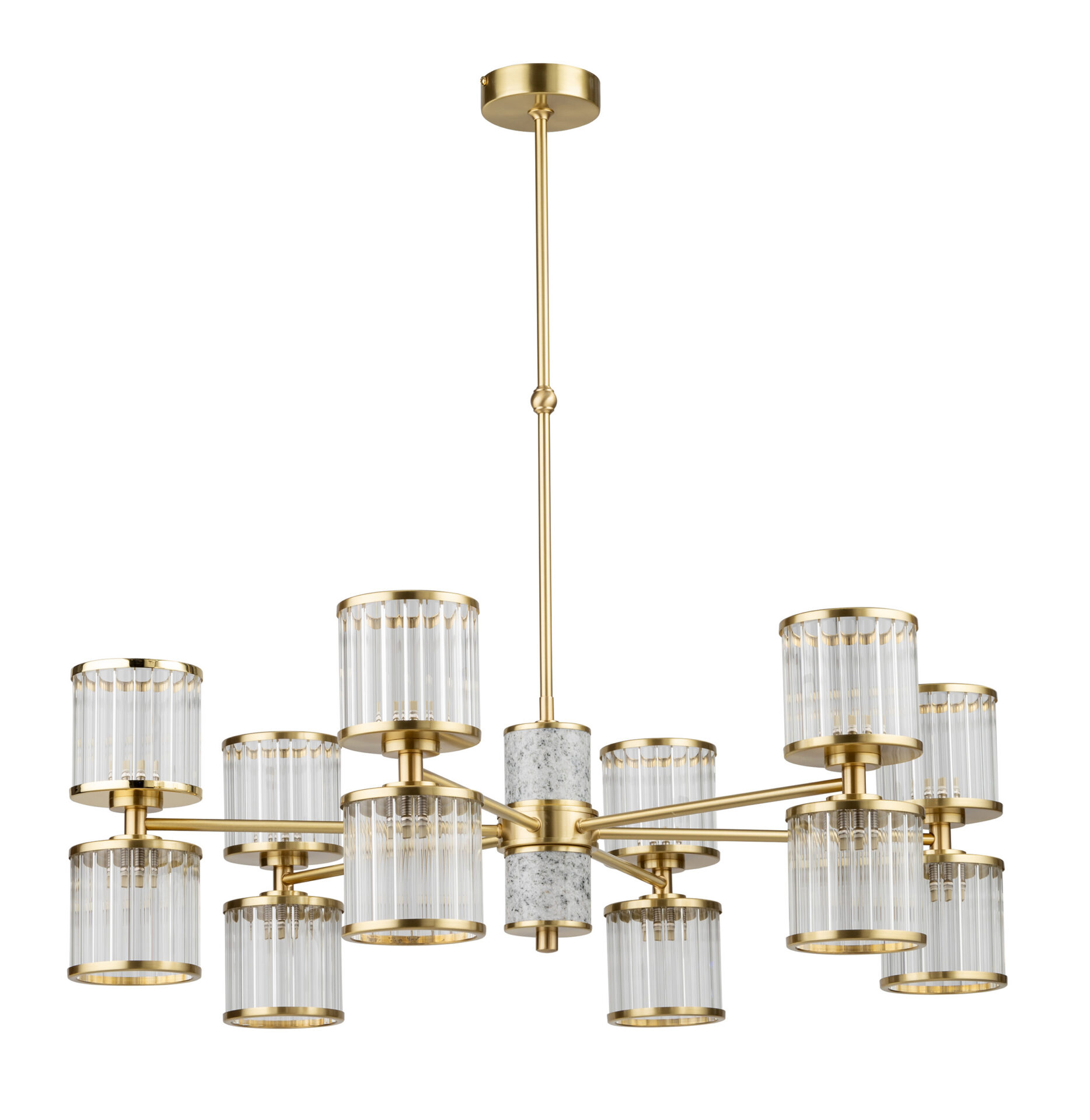 Подвесной светильник Erba с 12 цилиндрическими плафонами из прозрачного стекла — это сочетание классической симметрии и современной элегантности. Вертикальные призматические элементы создают уникальную игру света и тени, а золотистая латунь в сочетании со вставкой под светлый мрамор делает эту модель по-настоящему выразительной и премиальной.