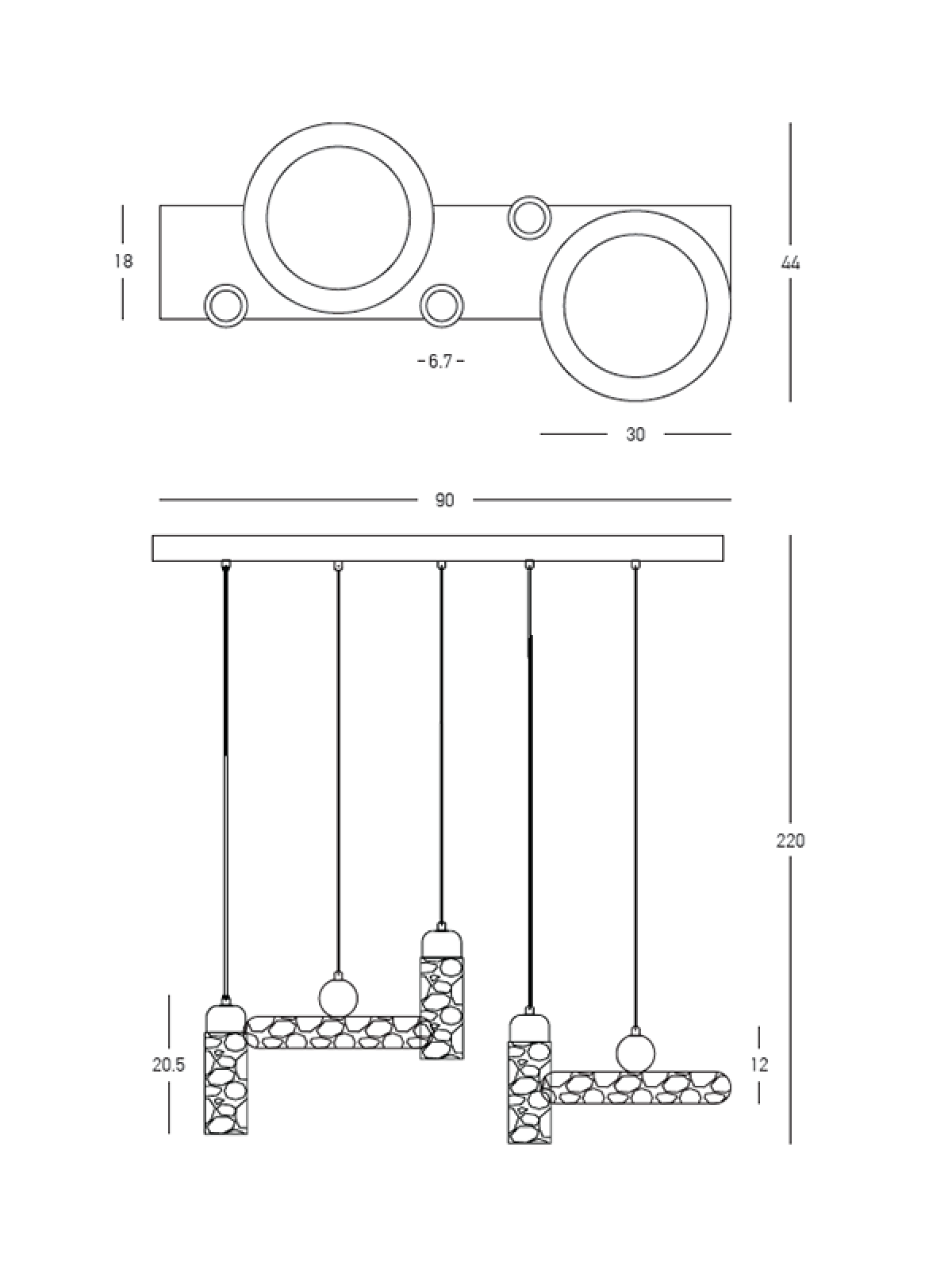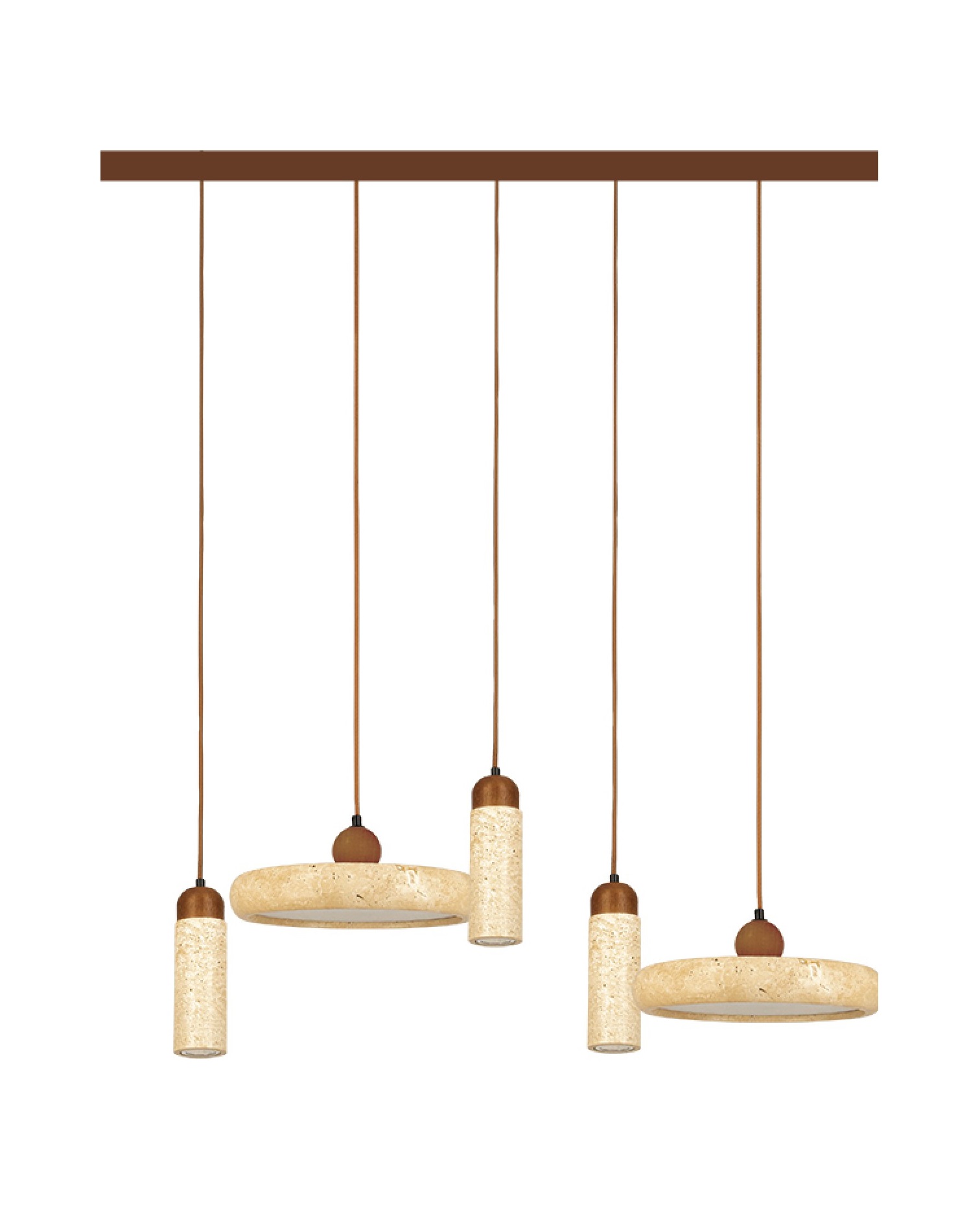 Подвесной светильник 25451 от Zambelis Lights сочетает природную эстетику и современный дизайн. Конструкция из пяти подвесных элементов — трёх цилиндрических и двух кольцевых — создаёт визуально гармоничную композицию. Поверхность с эффектом натурального камня и акценты в тёплом коричневом цвете придают светильнику уют и элегантность.