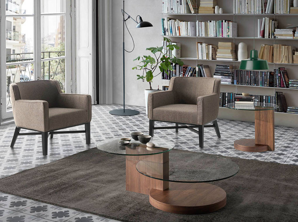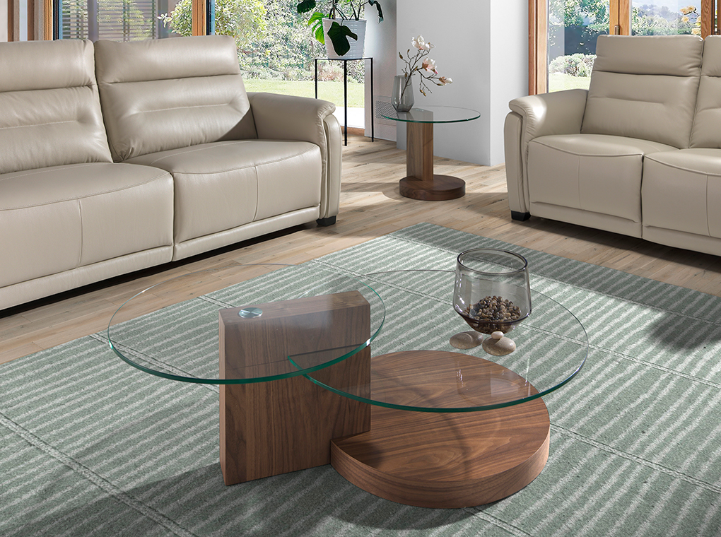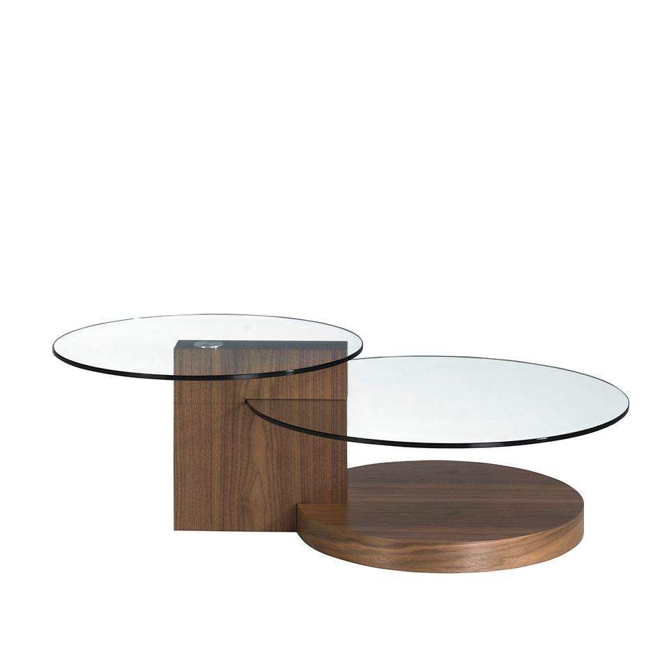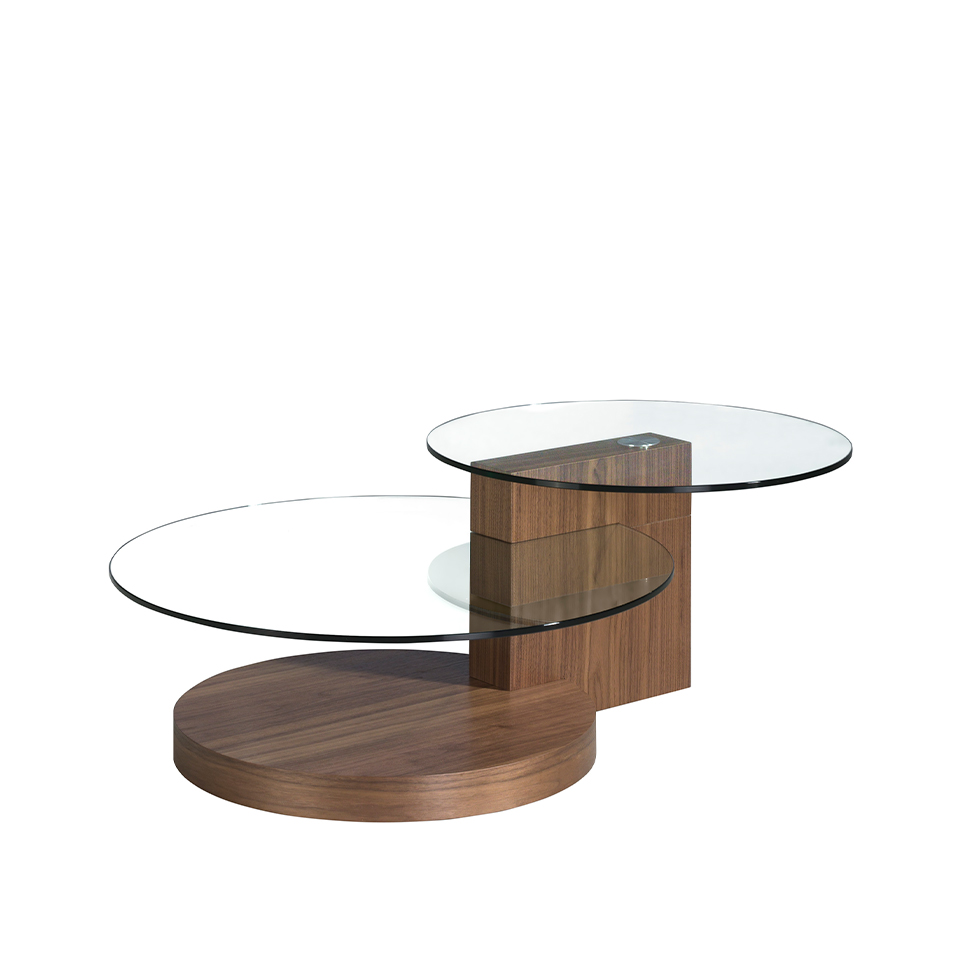 Moodse disainiga kohvilaud kahe ümmarguse 10 mm karastatud klaasist pealispinna ja poleeritud servadega. Selle 0,5 mm paksune naturaalsest pähklipuust spoonitud alus ja sammas annavad teie koju stiili ja eripära, mida otsite. See kohvilaud on selge näide sellest, et originaalsus, elegants ja funktsionaalsus võivad käia käsikäes. Ideaalne ese modernse ja stiilse keskkonna loomiseks.
