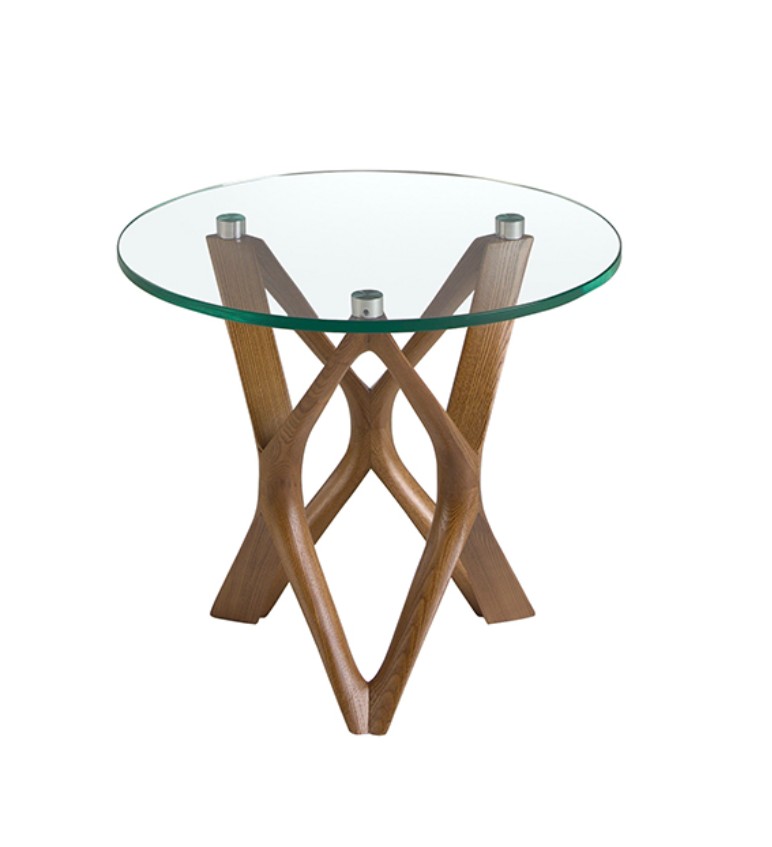 Moodne ümmargune diivanilaud karastatud klaasist pealispinnaga ja originaalsete pähklipuu värvi puidust jalgadega. Lihtsa, kuid originaalse disainiga laud, mis lisab ainulaadse ja isikupärase puudutuse.