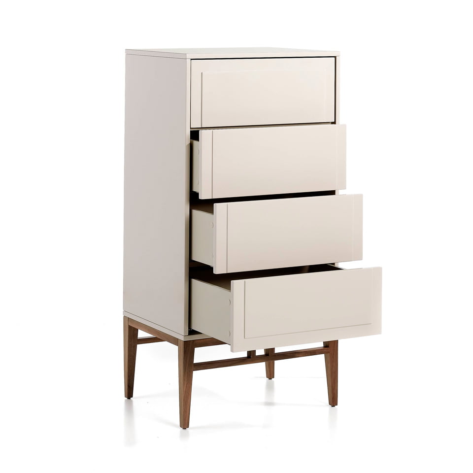 Moodsa disainiga kõrge kummut beeži MDF-ist puitkonstruktsiooni ja originaalsete naturaalsest pähklipuu spoonist jalgadega. Elegantne kummut, mis lisab igasse ruumi modernset stiili ja aitab hoida kõik vajalik korras tänu neljale sahtlile, mis on varustatud push-süsteemi ja pehme sulgumise mehhanismiga.