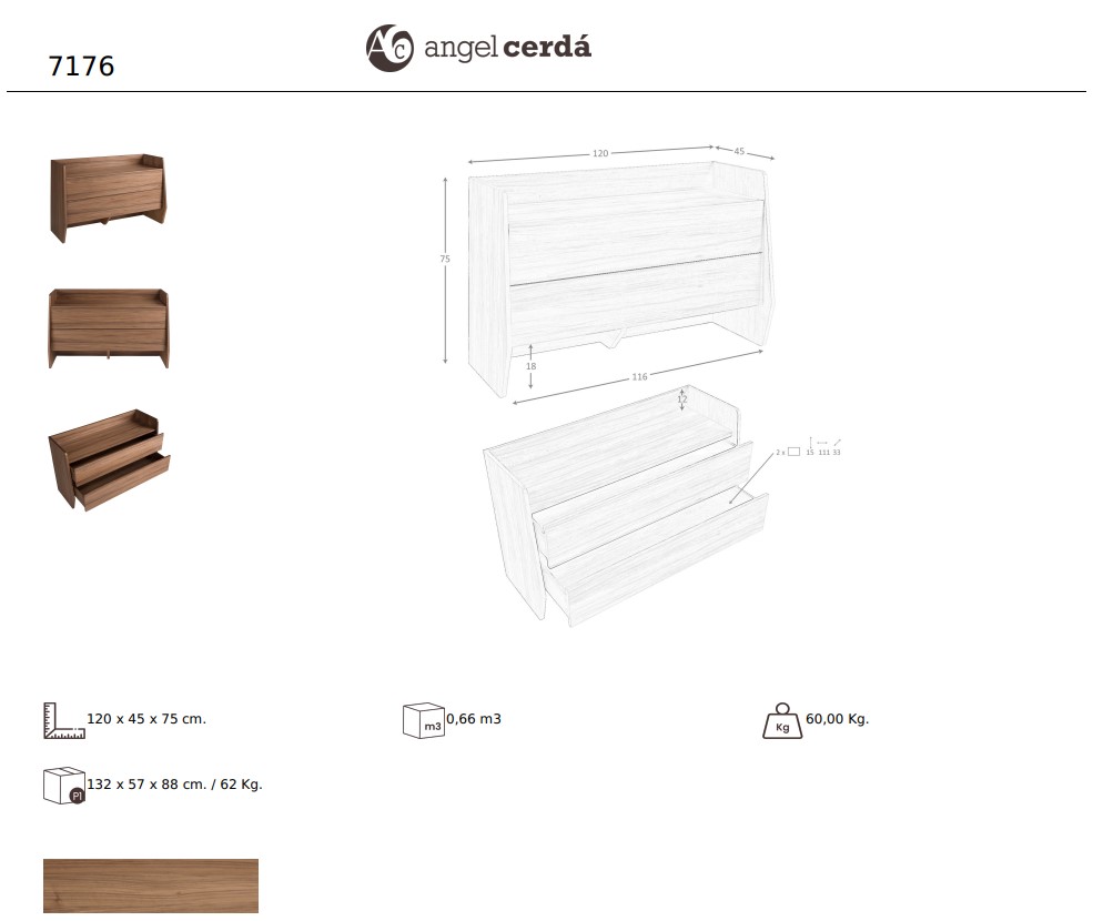Kaasaegse disainiga kummut, valmistatud 0,5 mm paksusest pähklipuu spooniga kaetud puidust. Elegantne ja stiilne mööbliese, mis lisab ruumile soojust ning isikupära. Kummut pakub ka rohkelt hoiuruumi tänu kahele esipaneelil asuvale sahtlile, millel on vajutusega avanev süsteem ja pehme sulgumismehhanism.