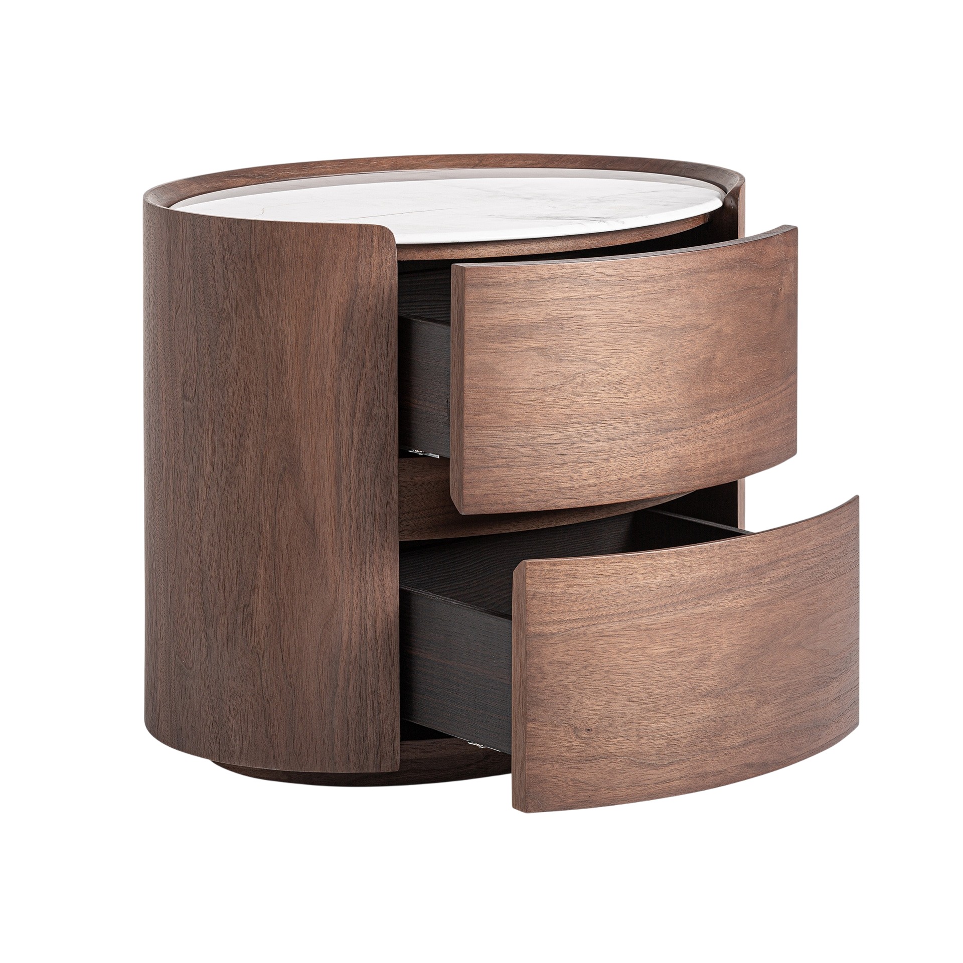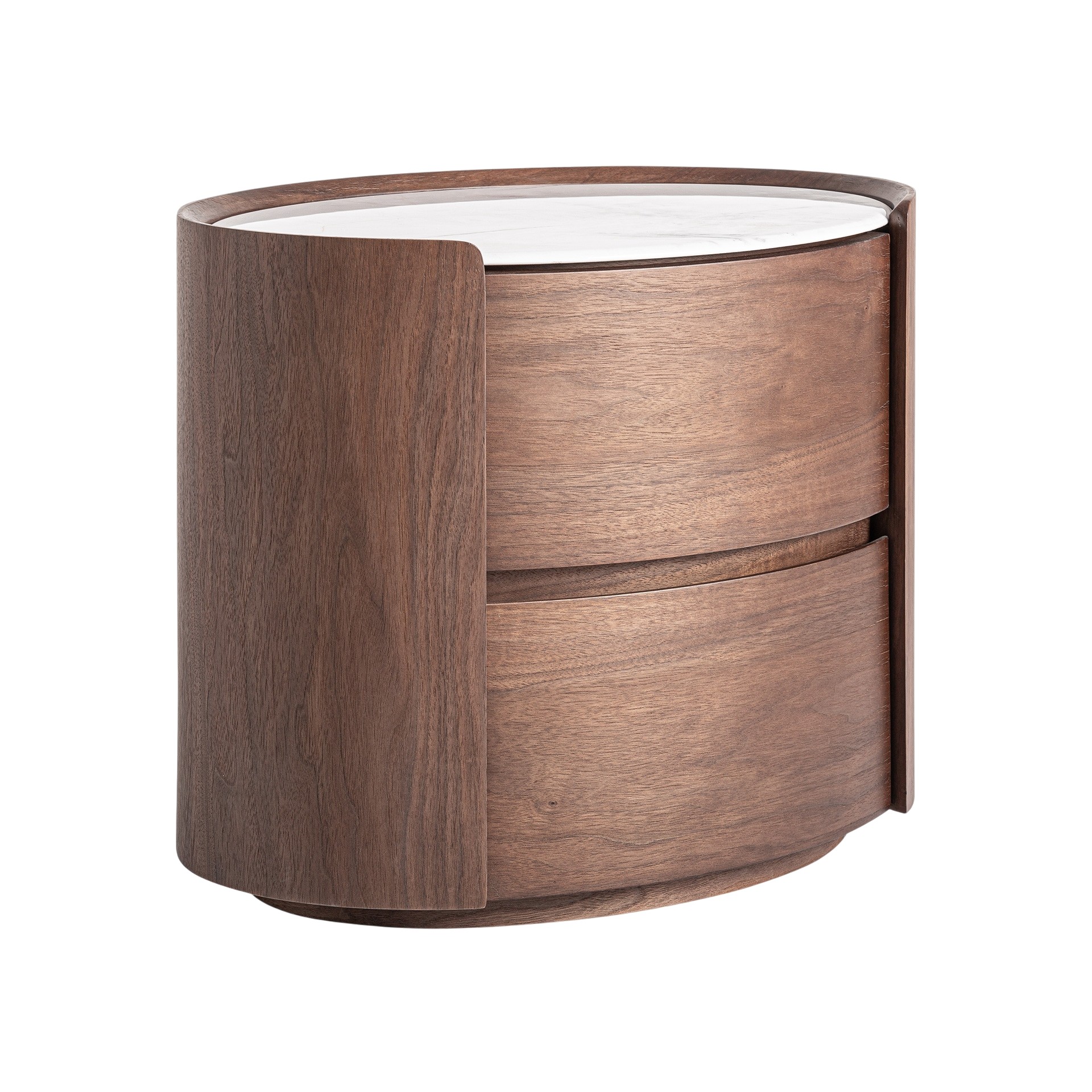 Elegantne ja modernne öökapp Stuetta ühendab luksuslikku materjalikasutust ning täiuslikult läbimõeldud disaini. Ümarate vormide ja sileda pähklipuidust viimistlusega öökapp sobib ideaalselt nii klassikalisse kui ka kaasaegsesse interjööri. Tume puit lisab ruumile soojust ja sügavust, samas kui valge marmorilaadne plaat kapi pealispinnal pakub luksuslikku kontrasti. Kaks sahtlit võimaldavad mugavat hoiustamist — ideaalne koht raamatutele, prillidele või öökapilampidele.