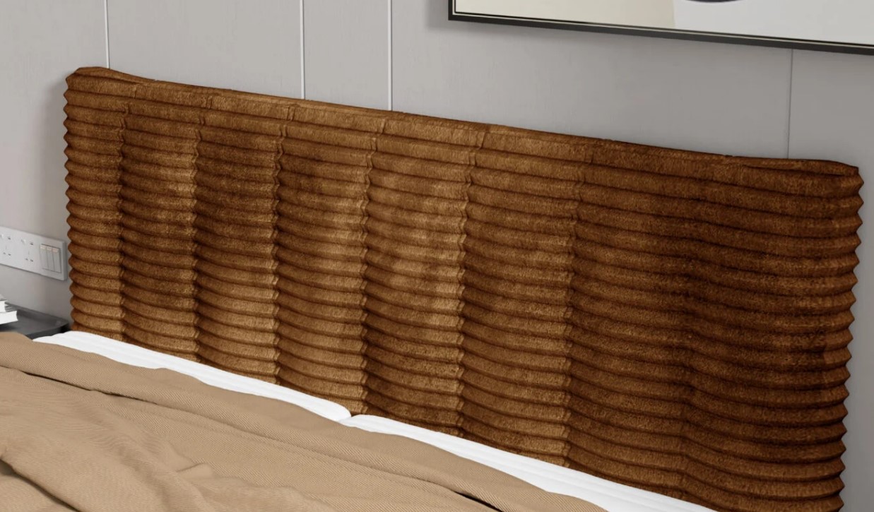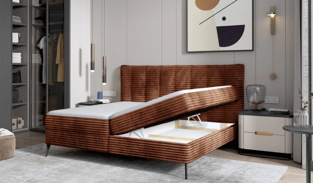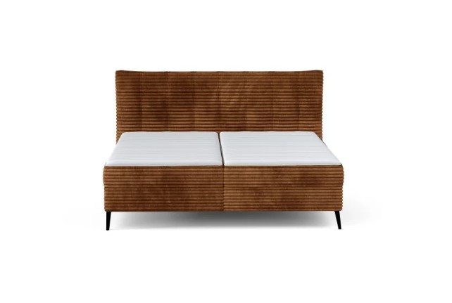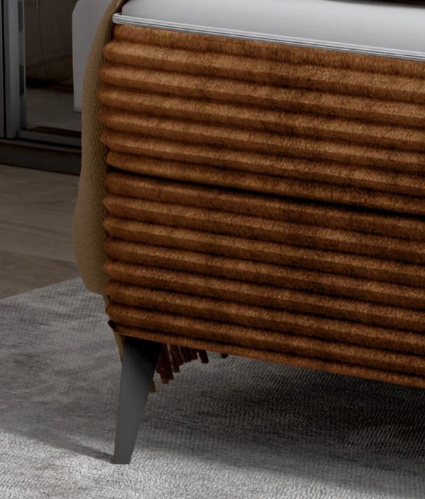 Modernne ja funktsionaalne voodi, millele annab iseloomu sügavpruunist sametkangast horisontaalne sooneline tekstuur. Peats koosneb suurtest paneelidest, mis loovad visuaalselt luksusliku, kuid rahuliku rütmi. Voodi elegantne vorm ühendab pehme polsterduse ja minimalistlikud mustad metalljalad, muutes kogu disaini harmooniliselt kaasaegseks.