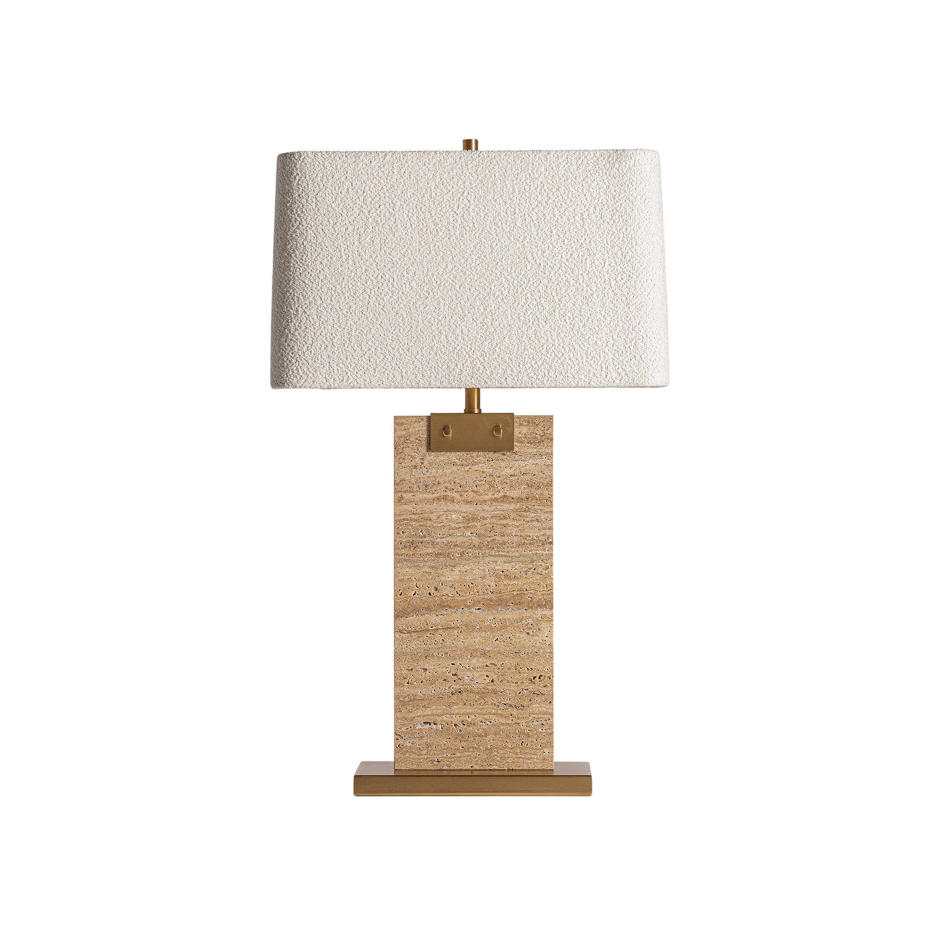 Laualambi korpus on valmistatud pruunist travertiinist, mille looduslik kihilisus ja soe kivitoon annavad esemele maalähedase, kuid modernse ilme. Travertiin on kombineeritud kuldse rauaga, mis toob disaini juurde luksuslikku aktsenti ja visuaalset kontrasti. Kompositsiooni täiendab valkjast buklee- puuvillast lambivari, mille rikkalik tekstuur pehmendab kivi ja metalli tugevust ning loob ruumi sooja, ühtlaselt hajutatud valguse.