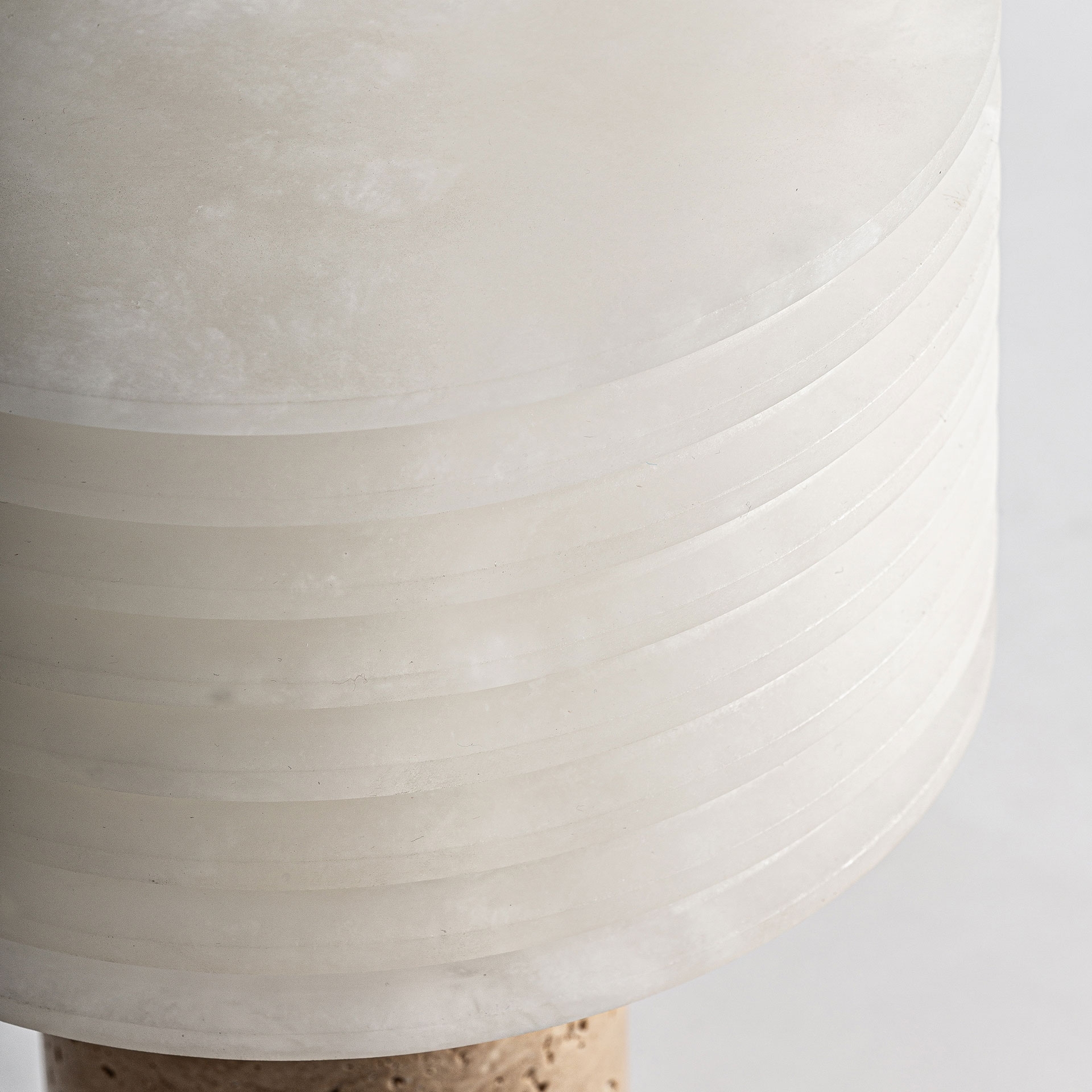 Lambivari on valmistatud poolläbipaistvast valgest kivimassist, millel on õrn horisontaalne struktuur. See loob valguse ümber pehme, ühtlaselt hajutatud kuma, mis kontrasteerub kaunilt travertiini massiivsusega. Varju huvitav servaprofiil lisab disainile modernset rütmi ja arhitektuurset sügavust.