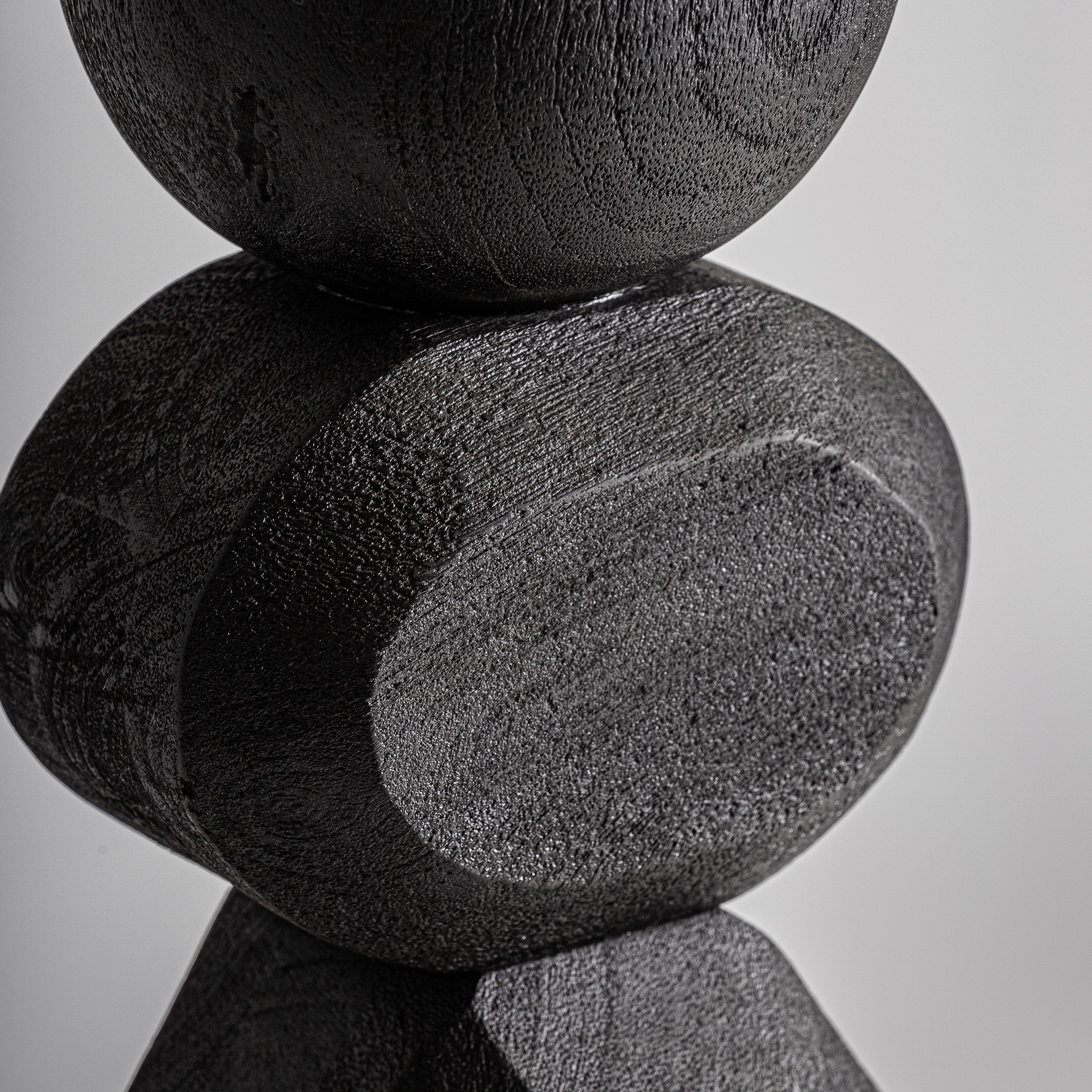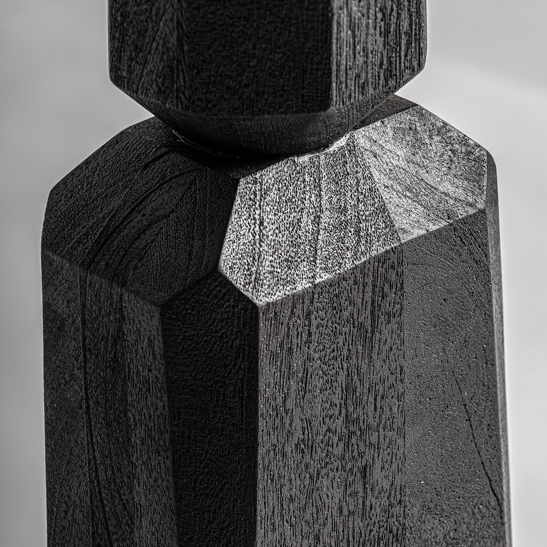 Vicali Cogne laualamp on skulpturaalne ja tugeva iseloomuga sisustuselement, mis ühendab käsitöölise puiduviimistluse ja arhitektuurse vormikeele. Lambi alus on valmistatud täispuidust ning viimistletud sügavas mattmustas toonis, mis rõhutab selle tahutud geomeetrilisi mahte. Mitmest eri kujuga plokist koosnev vertikaalne ülesehitus muudab lambi ruumis kunstiteoseks, mitte pelgalt valgustiks.