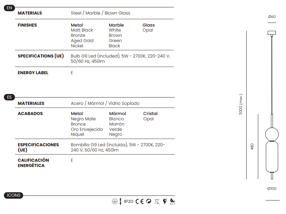 Minimalistlik siluett, hoolikalt valitud materjalid ning elegantne proportsioon muudavad selle rippvalgusti nii funktsionaalseks valgusallikaks kui ka sisekujunduslikuks kunstobjektiks, mis täiendab ka kõige nõudlikumat interjööri.