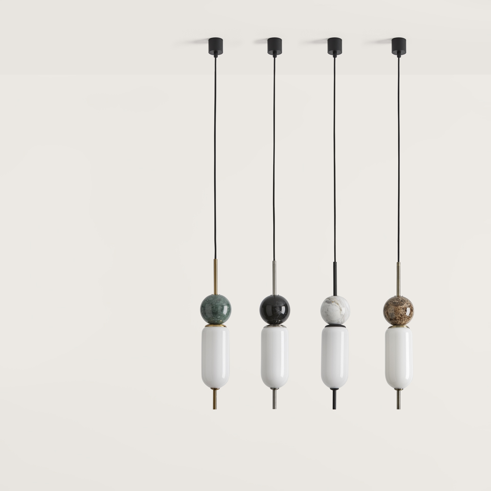 Vertikaalne vorm joonistub ruumis graafilise joone ja valgusaktsendina, muutes valgusti ideaalseks mulje loomiseks söögilaua kohale, magamistuppa, elutoa lounge-alasse või korrusvahelistesse avatud ruumidesse. Klaaselement tagab ühtlase, silmasõbraliku valguse, samal ajal kui marmorist detail toimib luksusliku fookuspunktina.