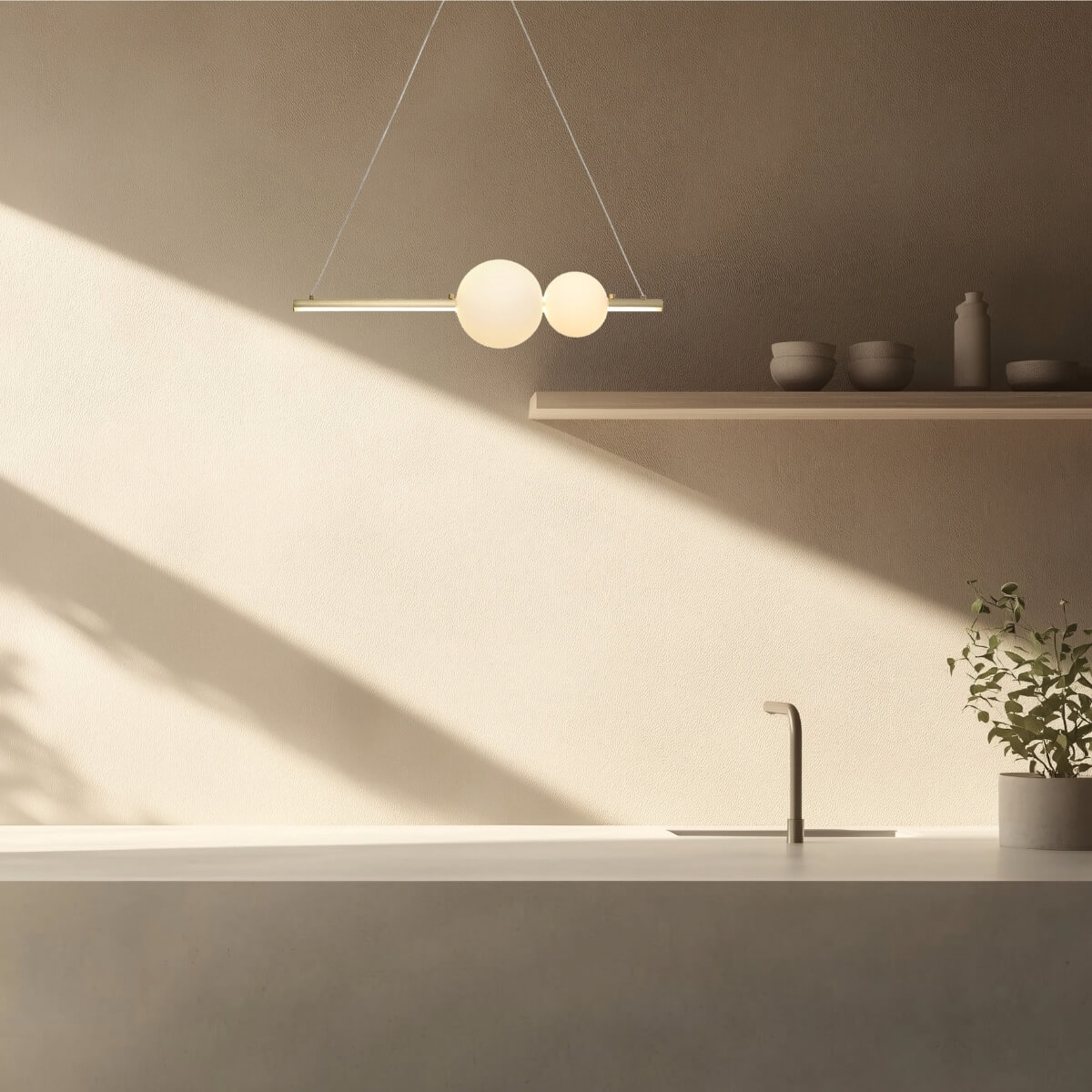 Rippvalgusti Zambelis Lighting kollektsioonist, saadaval IDEAhome e-poes, on kaasaegse disaini ja peene elegantsi täiuslik kooslus. Valgusti koosneb õhulisest kuldse viimistlusega metallvardast, millele on kinnitatud kaks erineva suurusega opaalvalget klaaskuuli, tuues ruumi tasakaalu ja visuaalset harmooniat.