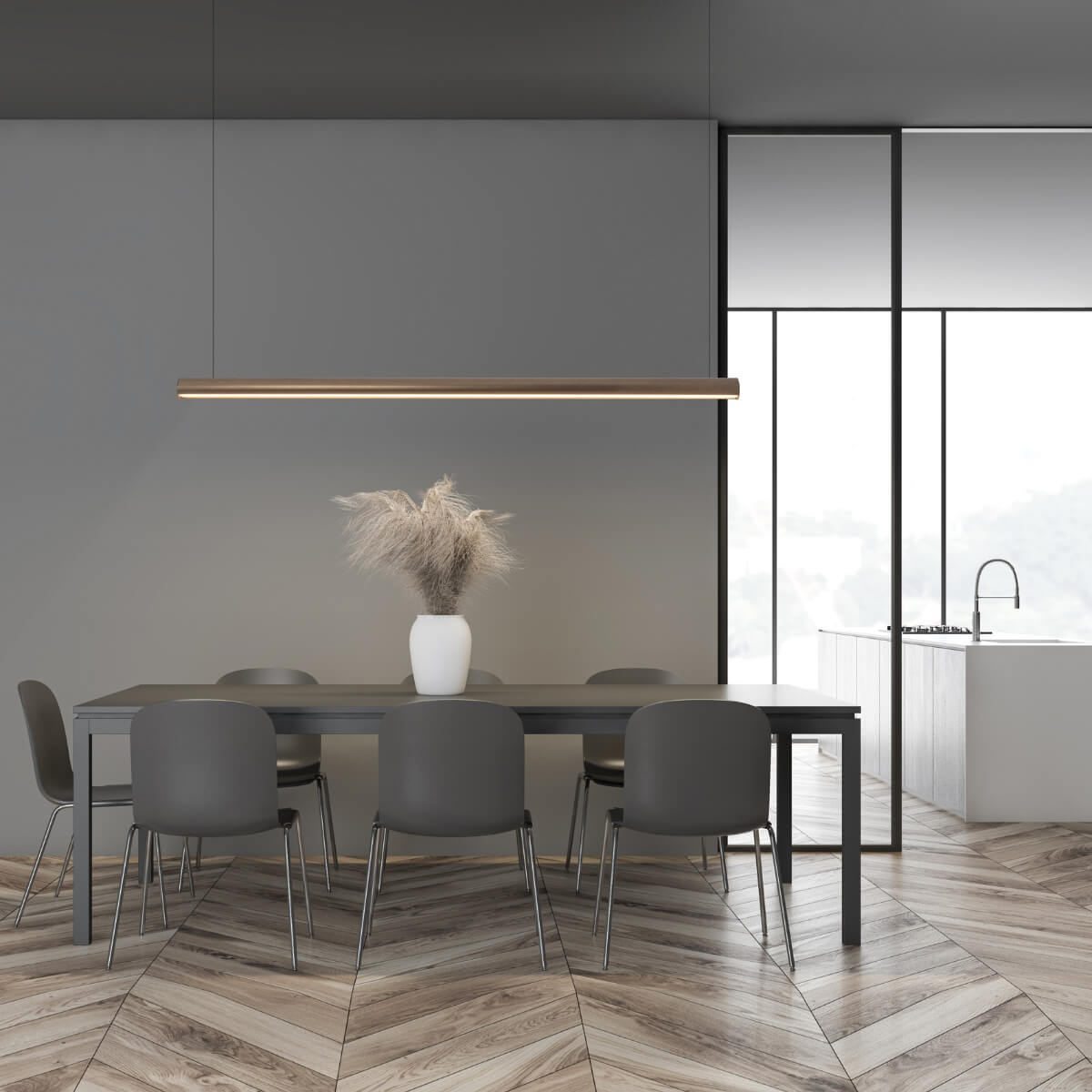 Valguskiir suunatakse allapoole, pakkudes ühtlast ja meeldivat valgust — ideaalne lahendus söögilaua või tööpinna valgustamiseks. Õhuline riputussüsteem muudab valgusti visuaalselt kergeks ning laseb kuldsel toonil ruumis õrnalt esile tõusta.