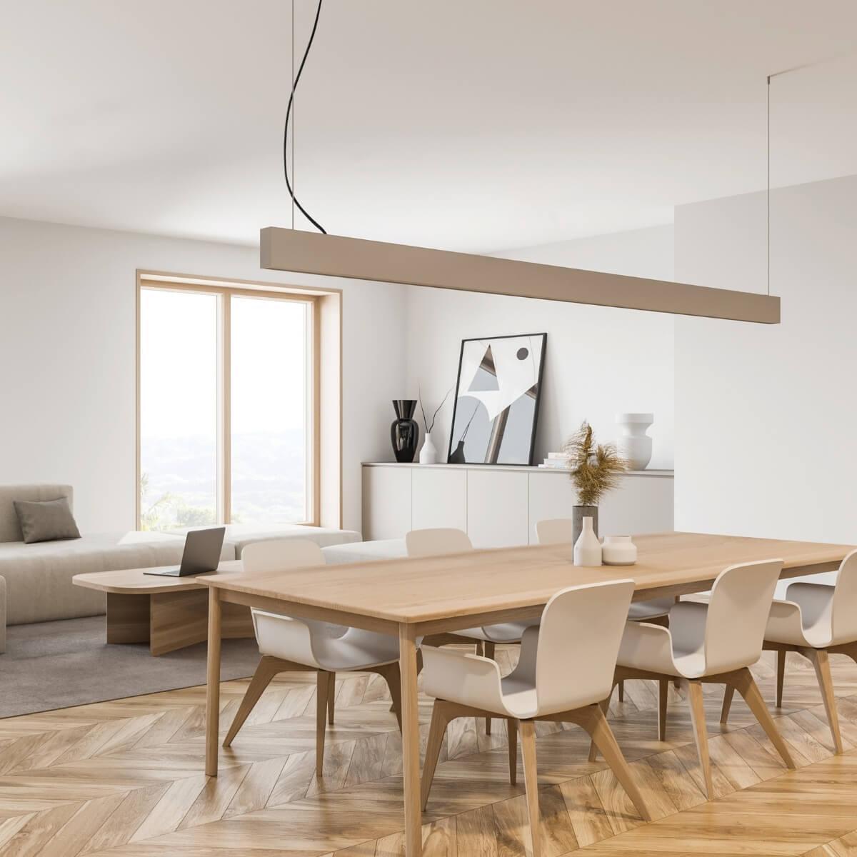 Rippvalgusti Zambelis Lighting kollektsioonist, saadaval IDEAhome e-poes, mis sobitub ideaalselt minimalistlikku ja skandinaaviapärasesse interjööri. Valgusti on pikliku geomeetrilise kujuga, pakkudes ühtlast ja hajutatud valgust kogu laua ulatuses – ideaalne lahendus söögilaua või tööpinna kohale.