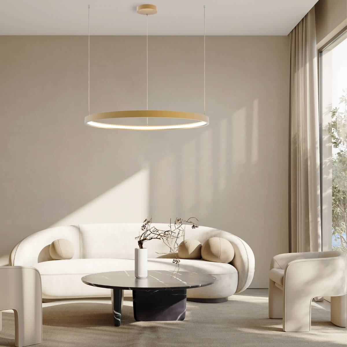 Rippvalgusti Zambelis Lighting kollektsioonist, saadaval IDEAhome e-poes, on kaasaegse disaini ja elegantse lihtsuse täiuslik ühendus. Selle õhuline, geomeetriline vorm ja kuldne mattviimistlus loovad modernse ja minimalistliku ilme, mis sobib suurepäraselt nii kodusesse interjööri kui ka avalikesse ruumidesse. Valgusti ühtlane LED-valgus hajub pehmelt läbi alumise difuusori, tagades meeldiva ja funktsionaalse valgustuse.