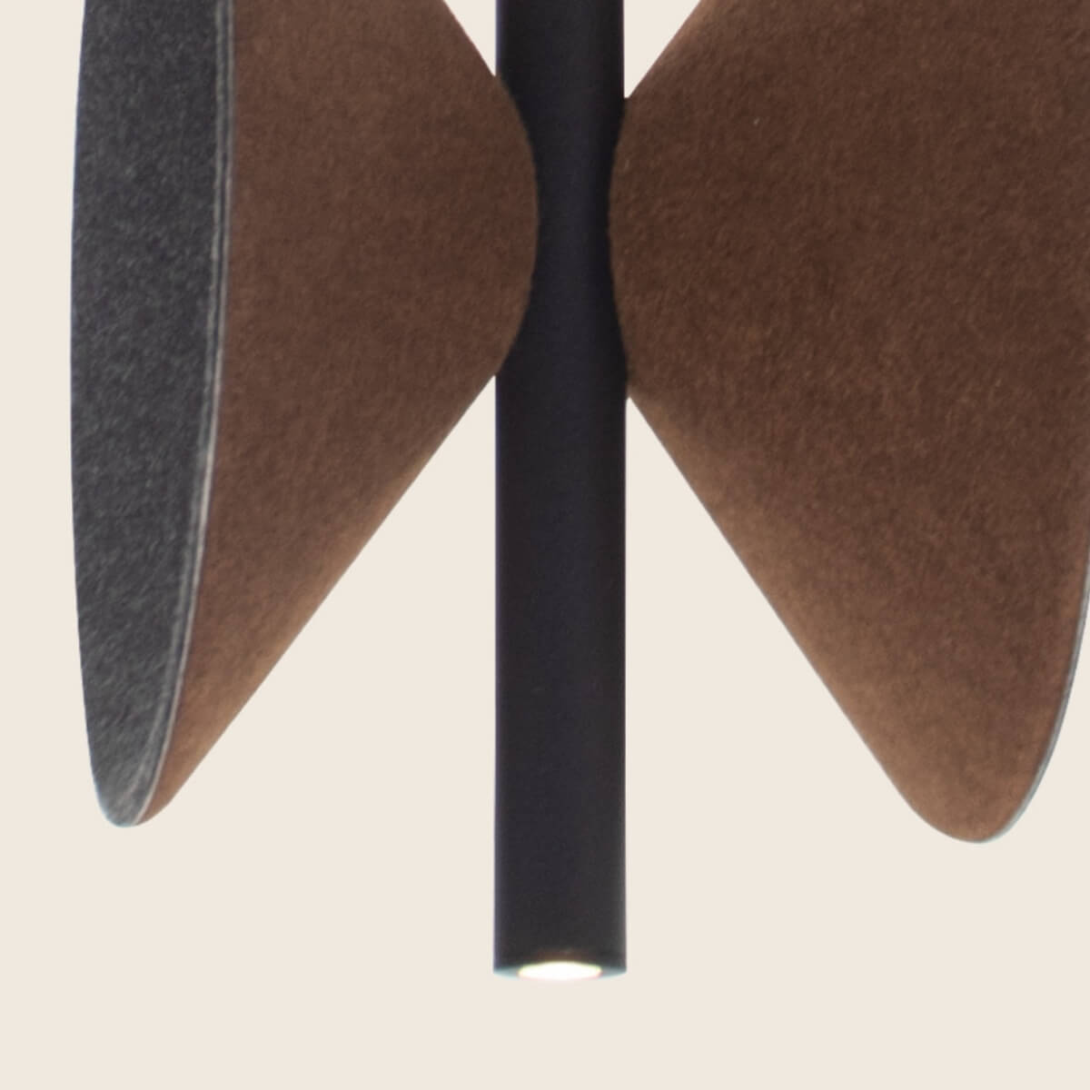 Rippvalgusti Zambelis Lighting kollektsioonist, saadaval IDEAhome e-poes, on julge ja kaasaegne disainielement, mis ühendab geomeetrilise vormi ja kontrastsed materjalid. Valgusti on valmistatud metallist ning selle keskosa läbib kaks vastandlikku, ümarat vildist ketast — üks sügavpruunis, teine antratsiithallis toonis. See ootamatu kombinatsioon loob ainulaadse visuaalse efekti, lisades ruumi soojust ja tekstuuri.