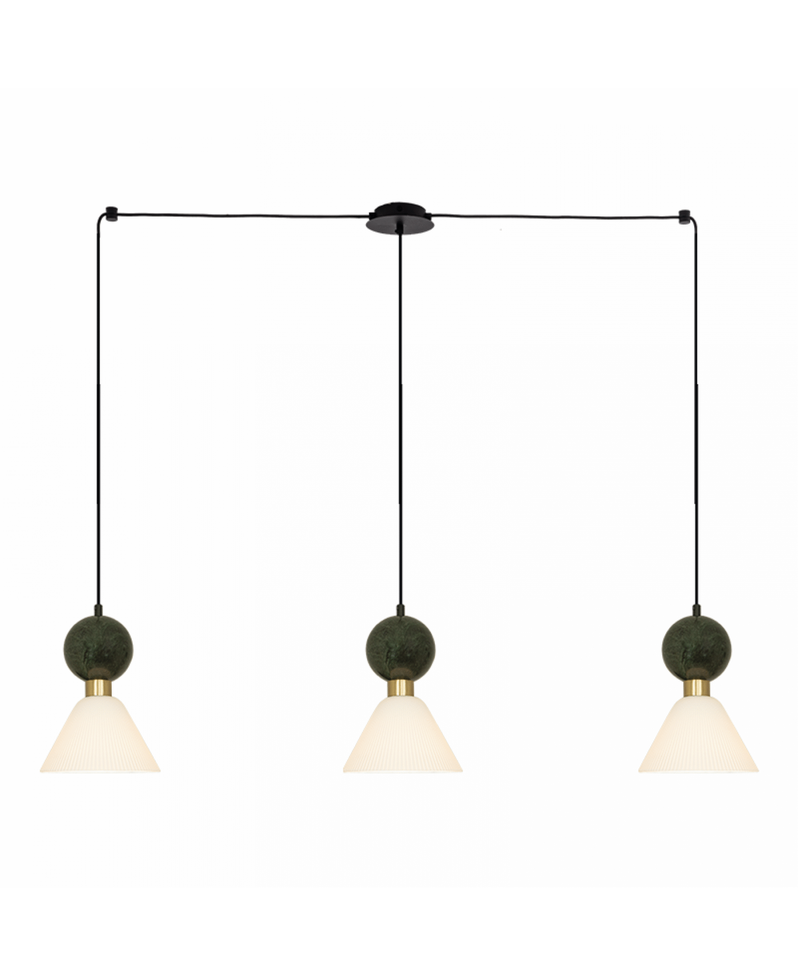 Rippvalgusti Zambelis Lighting kollektsioonist saadaval IDEAhome e-poes, ühendab elegantsi, modernse vormi ja luksuslikud materjalid. Valgusti koosneb kolmest koonusjase kupliga valgusallikast, mis on ühendatud mustade juhtmetega ja kaunistatud rohelise marmori, messingi ja kipsi kombinatsiooniga. See materjalide kooslus loob unikaalse visuaali ja toob ruumi soojust ning isikupära.