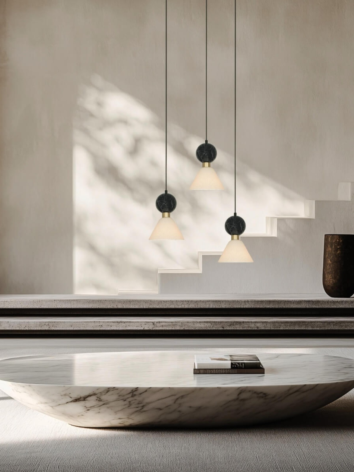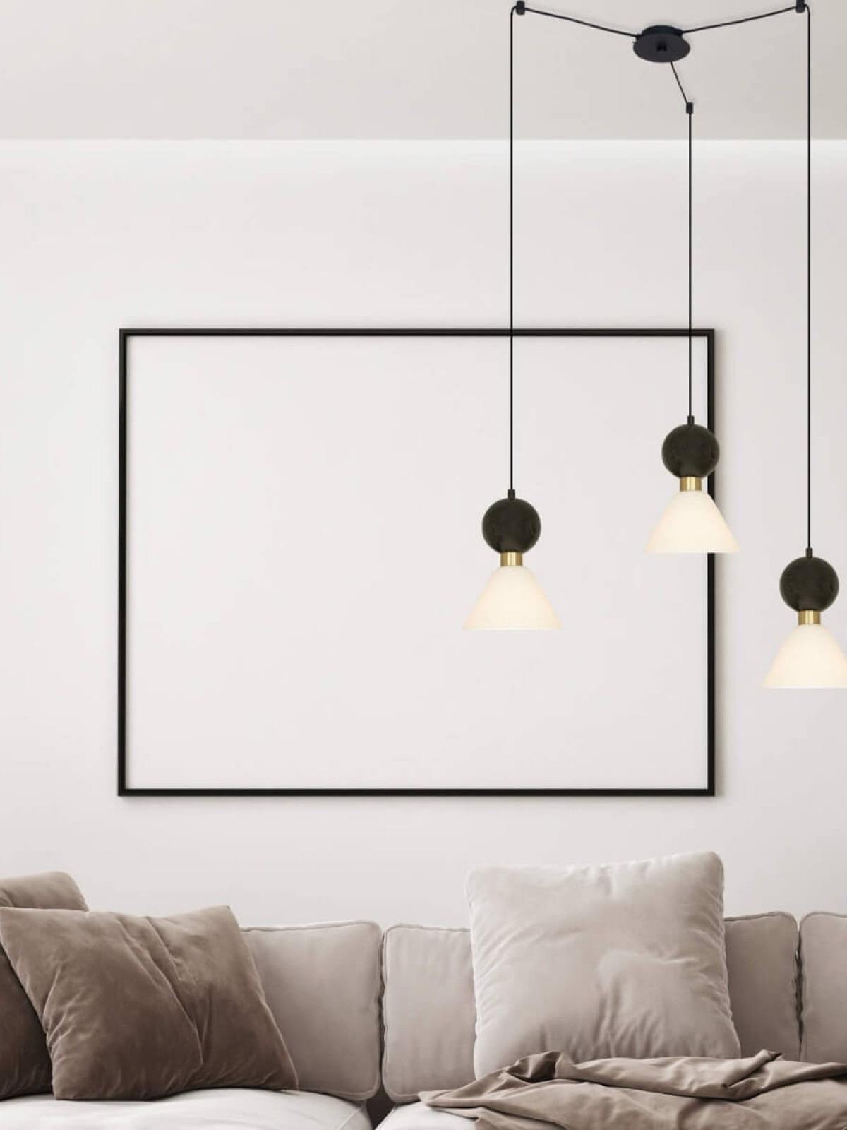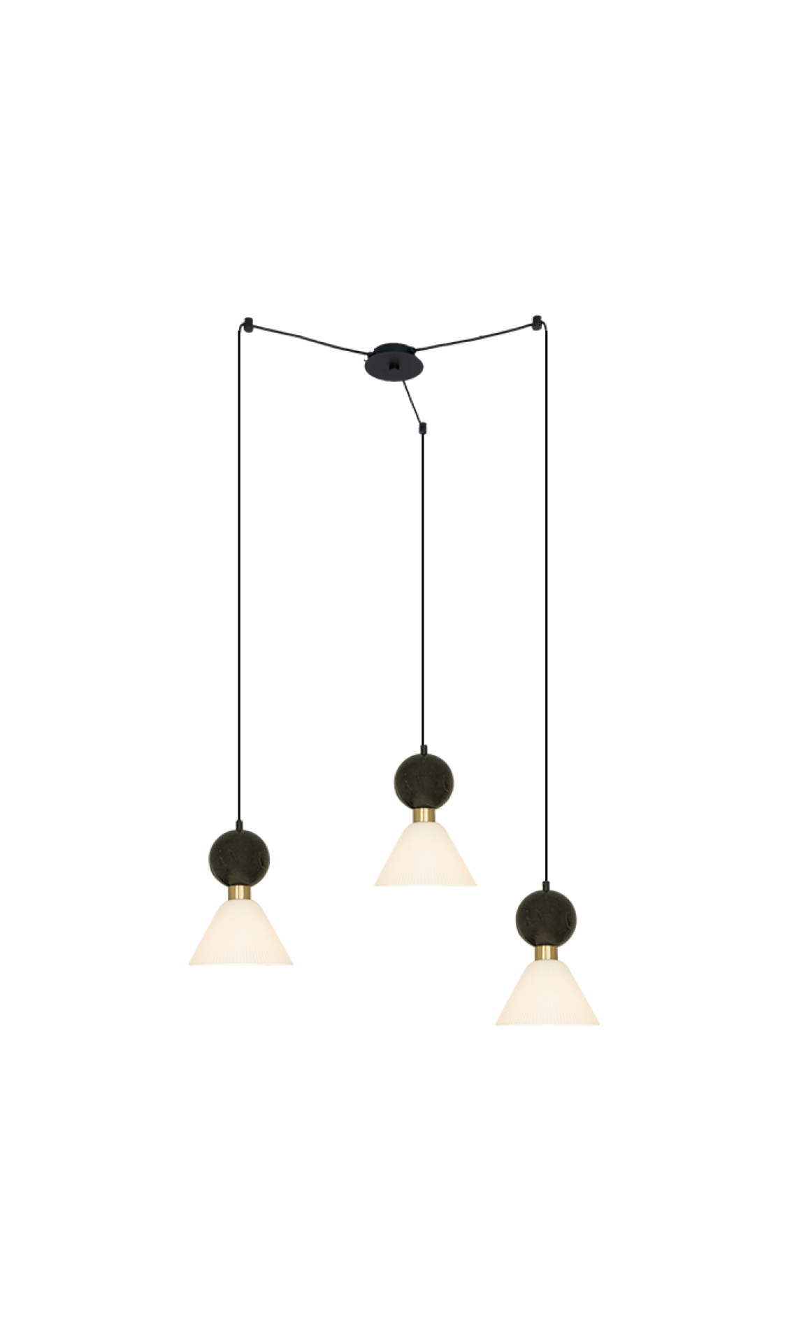 Zambelis Lighting rippvalgusti, saadaval IDEAhome e-poes, on elegantne ja samas looduslähedane valgusti, mis ühendab kvaliteetsed materjalid ja ajatult kauni disaini. Kolm koonusjat kupliga valgusallikat on ühendatud mustade juhtmetega ning kaunistatud musta marmori, messingist detailide ja kipsi kombinatsiooniga, mis loob harmoonilise ja luksusliku üldmulje.